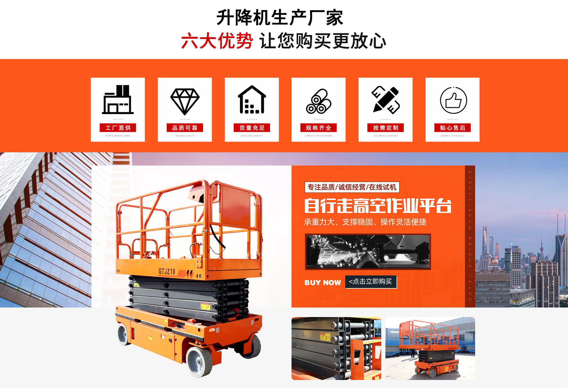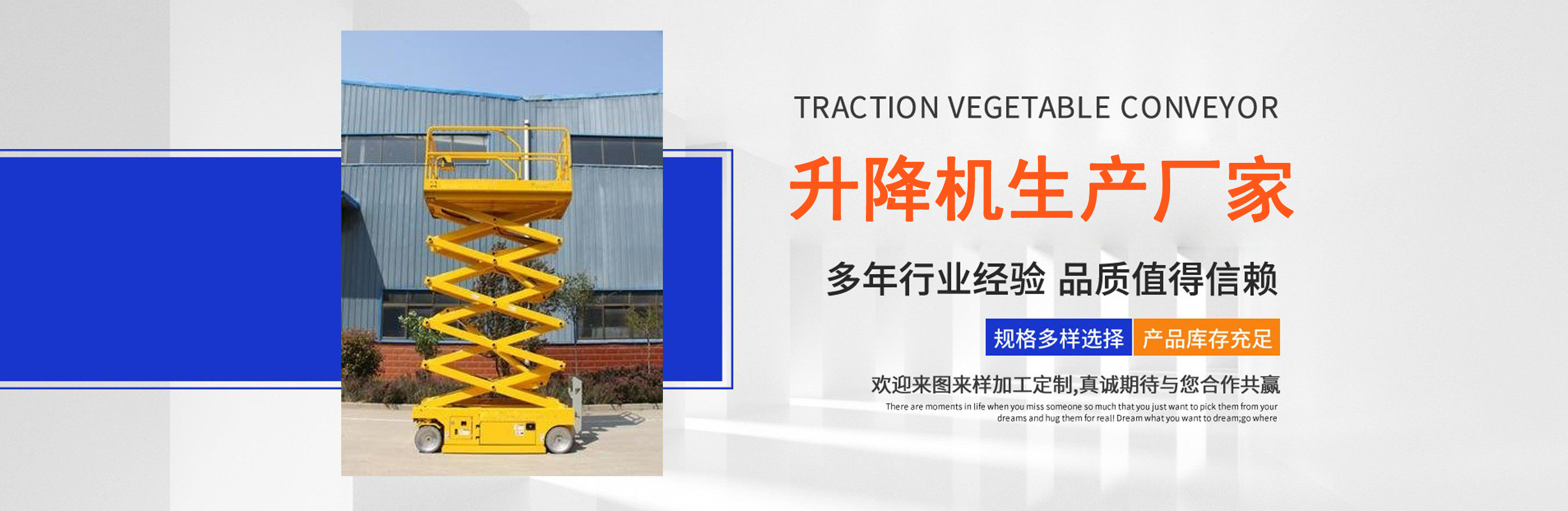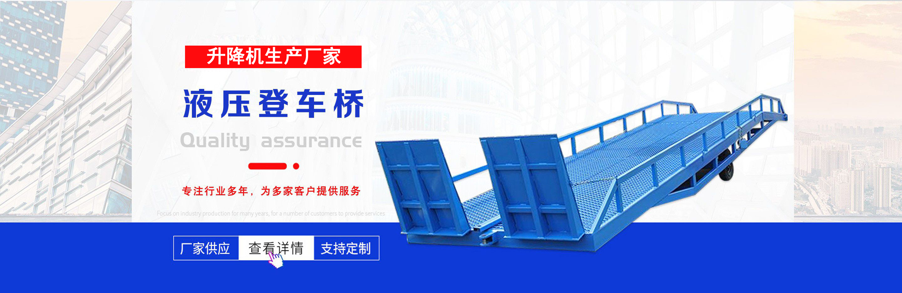 升降機生產廠家是專業從事升降平臺,液壓貨梯,卸豬臺,平板拖車,液壓提升機,移動式升降機,升降平臺車,高空作業設備,貨梯廠家,液壓登車橋等升降機械產品制造十余年,服務過各大國內外企業。 自公司創立以來,經過長期對液壓升降臺的研制和探索,積累了豐富的專業制造技術和寶貴經驗。憑借豐富的專業技術及不斷開拓創新的精神,現已成為專業于升降機械的公司。 長期以來,憑借公司不斷的壯大及對液壓技術的不斷改進和探索。能根據客戶不同的要求設計一套合理、完善的方案供客戶參考。現有產品:升降平臺,液壓貨梯,卸豬臺,平板拖車,液壓提升機,移動式升降機,升降平臺車,高空作業設備,貨梯廠家,液壓登車橋等。本產品在各類工礦企業、港口物流以及其它領域均發揮著重要的作用。始終以“以信譽求生存、以技術求發展”為本廠的經營理念。只要你選購我廠的產品,無論你身在何方都能得到我們迅捷優良的服務?! 」咀猿闪⒁呀泚肀局?quot;團結、求實、創新、互贏"的理念,以先進的技術和服務,為客戶建造滿意的產品。幾年來受到廣大客戶的好評。...